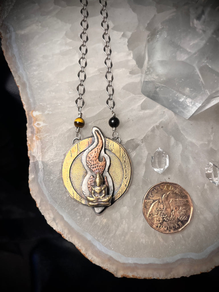 Multi layer mixed metal Buddha transformation pendant on 26” sterling plated chain with tigers eye bead detail.