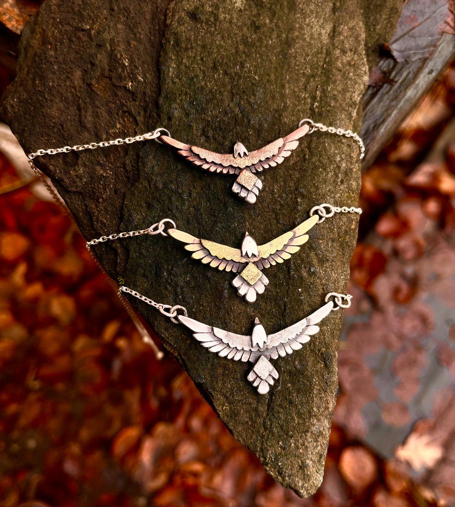 Materials: Sterling silver or brass with copper detail on 17-18” sterling chain and clasp. Both options backed with sterling silver.
